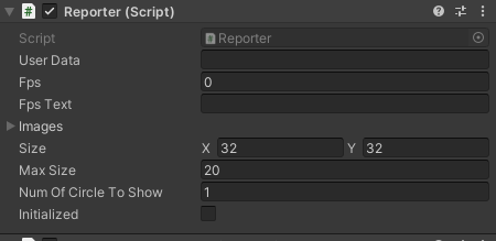 에디터에서 상당 메뉴에 `Reporter → Create`를 클릭하면 씬에 `Reporter` 오브젝트가 생성됩니다
