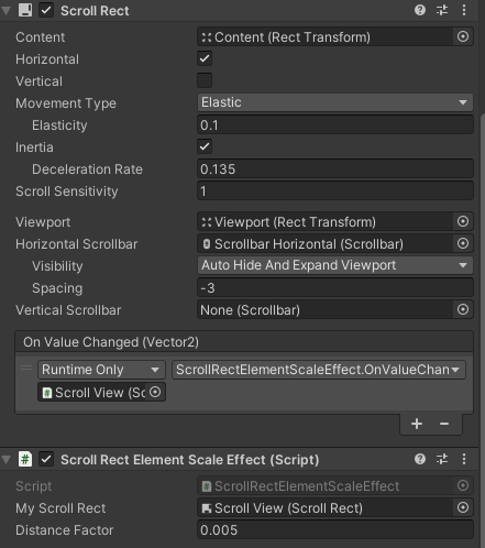 - `OnValueChanged`메소드를 `ScrollRect`컴포넌트의 `OnValueChanged`이벤트에다가 연결해야한다