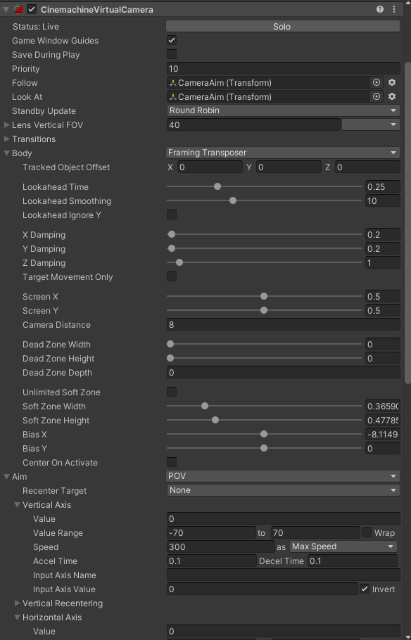 - Follow와 LookAt은 캐릭터 머리쪽에 빈 오브젝트를 만들고 넣어줬다
