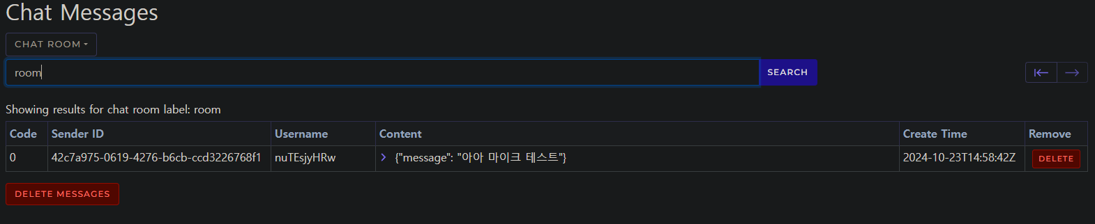 나는 룸이름을 `room`으로 지었으니 해당 이름으로 검색해보면 채팅 메세지가 검색된다