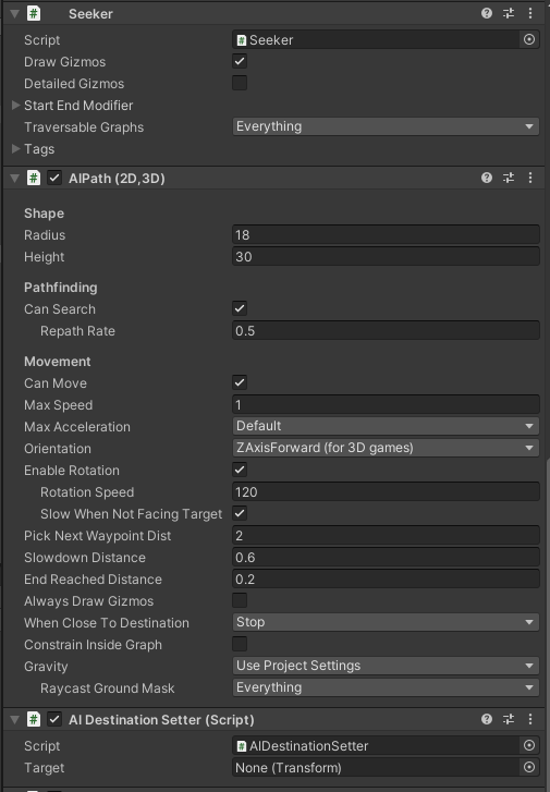 AI Destination Setter컴포넌트의 Target변수에 할당된 오브젝트를 쫒아 이동하는 방식이라