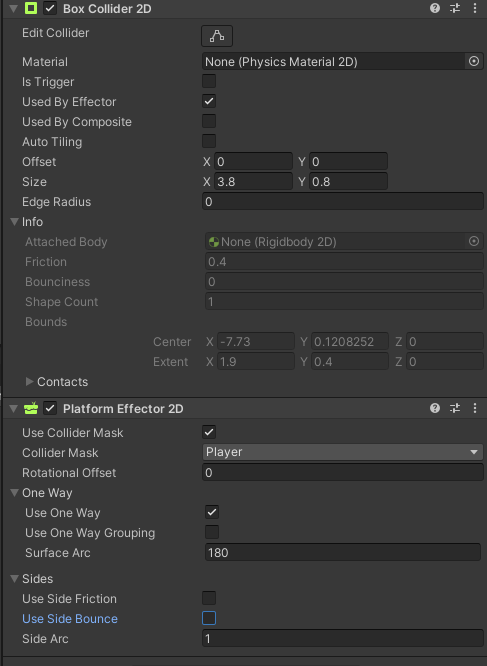 플랫폼 이펙터 2D는 일방 충돌, 측면 마찰/바운스 제거 등 다양한 “플랫폼” 동작을 적용합니다.