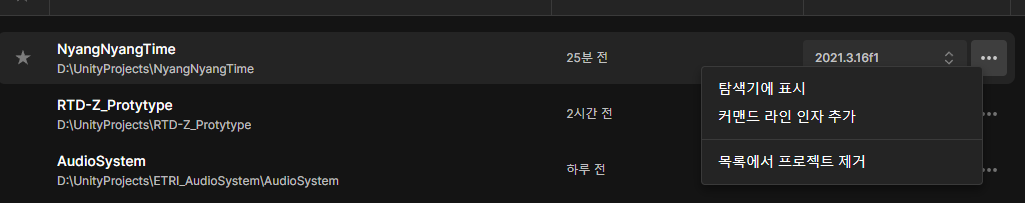 허브에서 프로젝트 옆에 점3개를 누르면 "커맨드 라인 인자 추가"가 있다.