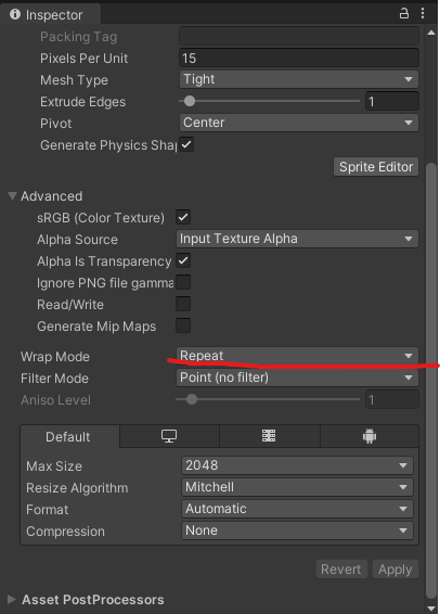 1. 텍스쳐 세팅에서 Wrap Mode를 Repeat으로 변경