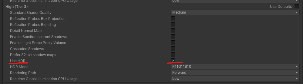 해결하는 방법은 위에서 활성화한 Use HDR 옵션 밑에있는 HDR Mode를 R11G11B10에서 FP16으로 바꿔주는것