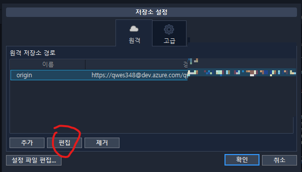 - 이제 소스트리에서 우측 위 설정을 누르고 원격 저장소 주소를 DevOps의 저장소 주소로 바꾸자
